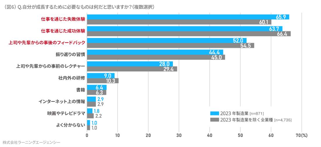 次に、自分が成長するために必要なものは何ですかと問いかけた。最多は「仕事を通じた失敗体験」が「65.9%」、「仕事を通じた成功体験」が「63.7%」、「上司や先輩からの事後フォードバック」が「52.0%」という結果になった。「仕事を通じた失敗体験」が必要だという意見は他業種よりも5.8ポイント高かった。