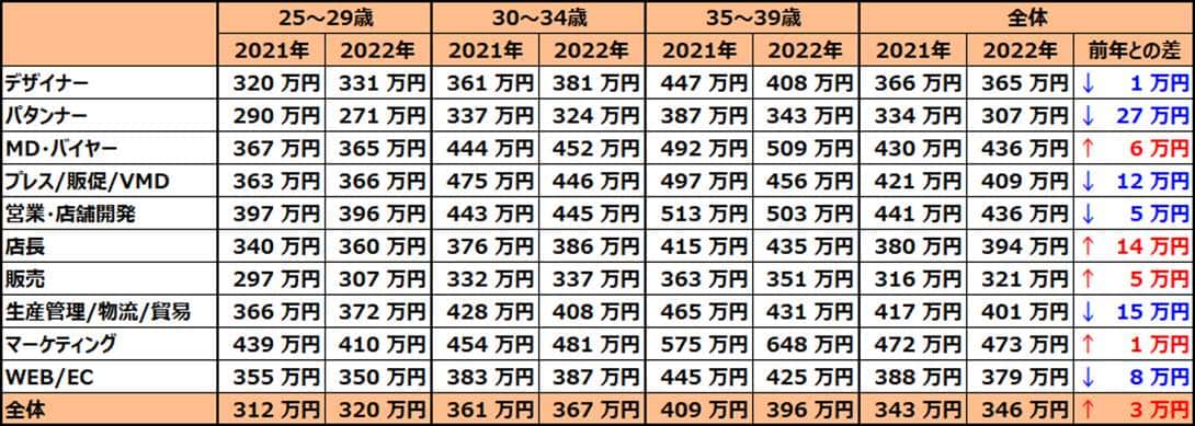 はじめに、2022年のアパレル・ファッション業界全体の平均年収は、346万円で前年の343万円を3万円上回った。