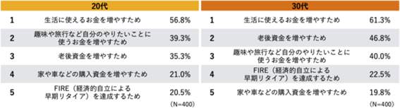 株式投資に取り組んでいる理由を20代、30代に分けて見てみると、どちらの年代も「生活に使えるお金を増やすため」が最多であることは共通していた。
