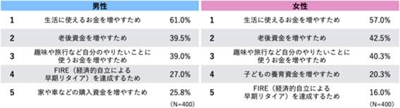 また、男女別にみると、男性では「FIREを達成するため」や「家やクルマなどの購入資金を増やすため」が上位に入り、女性では「子どもの養育資金を増やすため」が「FIRE」を抑えて4位にランクインした。【図3参照】
