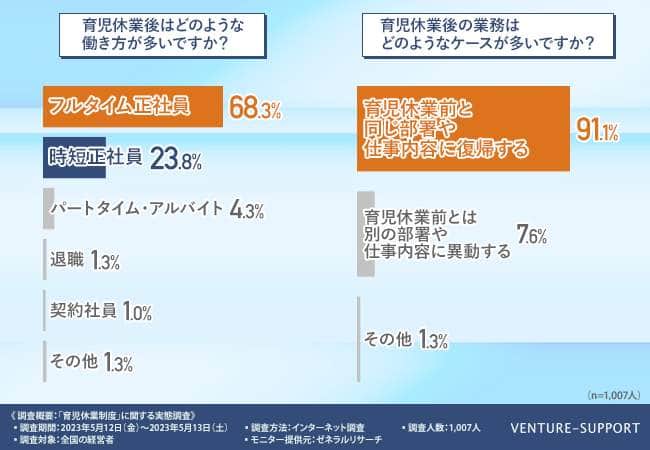 続いての質問では、「育児休業後はどのような働き方が多いですか?」と聞いた。「フルタイム正社員」は「68.3%」、「時短正社員」は「23.8%」、「パートタイム・アルバイト」は「4.3%」、「退職」は「1.3%」という結果になった。