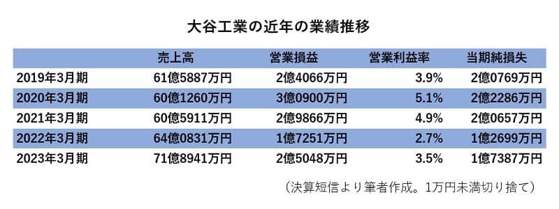 それではここで、大谷工業の近年の業績の推移を見てみましょう。