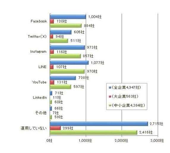 そうしたなか、SNSを「運用していない」と答えた企業は、54.8%(2715社)と半数を占めた。このうち、大企業が53.1%(299社)、中小企業でも55.1%(2416社)が「運用していない」と答えた。【図1参照】