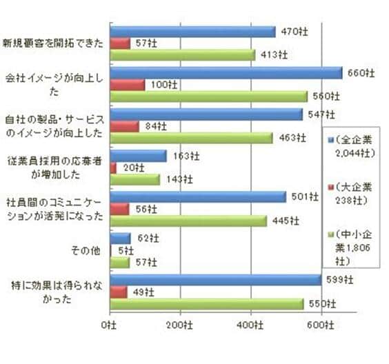 次いで、「自社の製品・サービスのイメージが向上した」が26.7%(547社)、「社員間のコミュニケーションが活発になった」の24.5%(501社)と続き、社内外への情報の訴求効果を評価している。