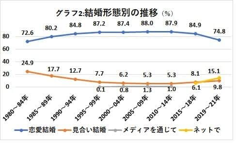 見合い結婚...1980~84年に24.9%→2005~09年に5.3%→19~21年に9.8% SNSなどネットの「出会い」からは増加傾向
