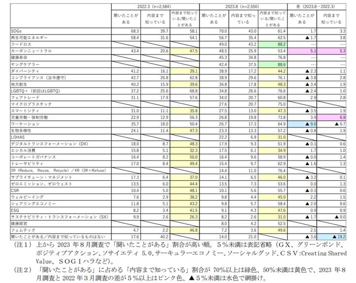 「内容まで知っている」と答えた割合は、「児童労働・強制労働」がプラス6.9ポイント、「カーボンニュートラル」がプラス5.3ポイント、「再生可能エネルギー」(プラス3.8ポイント)、「SDGs」(プラス3.3ポイント)で上昇しているほか、大半でわずかながら上昇している。