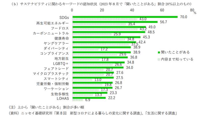 これらのほか、「健康寿命」(76.8%)や「LGBTQ+」(76.6%)、「3R(Reduce、Reuse、Recycle)/4R(3R+Refuse)」(76.4%)、「コンプライアンス(法令遵守)」(76.1%)、「マイクロプラスチック」(75.0%)、「児童労働・強制労働」(73.8%)が7割以上を占めた。