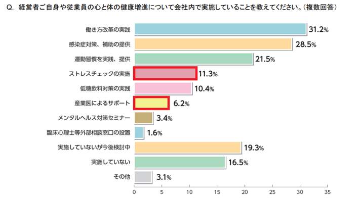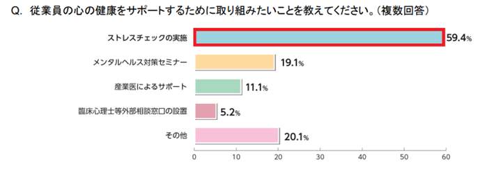 また、従業員の「心の健康」をサポートするために取り組みたいこと(複数回答)を、経営者に聞いたところ、59.4%の経営者が「ストレスチェックの実施」と答え、ダントツだった。【図2参照】