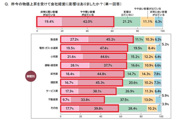 昨今の「物価上昇」について、会社経営に影響はありましたか(単一回答)との問いには、「非常に悪い影響が出ている」(19.4%)、「やや悪い影響が出ている」(42.0%)と答えた経営者は、合わせて 61.4%にのぼり、多くの経営者が物価上昇による悪影響を実感していることがわかった。