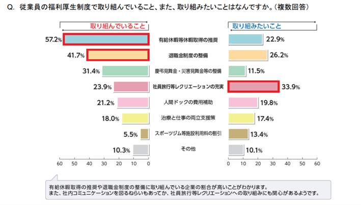福利厚生制度の取り組みに、「休暇取得の推奨」と「退職金制度の整備」