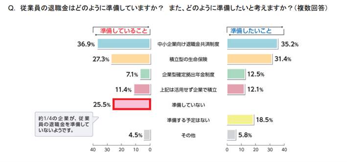 また、従業員の退職金について、どのように準備していますか? どのように準備したいと考えますか?(複数回答)と聞いたところ、約4分の1にあたる25.5%の中小企業の経営者が「準備していない」と答えた。
