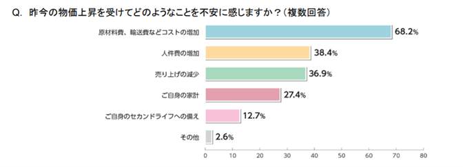 昨今の物価上昇で、中小企業の経営者は「原材料費、輸送費などのコストの増加」(68.2%)や「人件費の増加」(38.4%)、「売り上げの減少」(36.9%)に、不安に感じているようだ。【図5参照】
