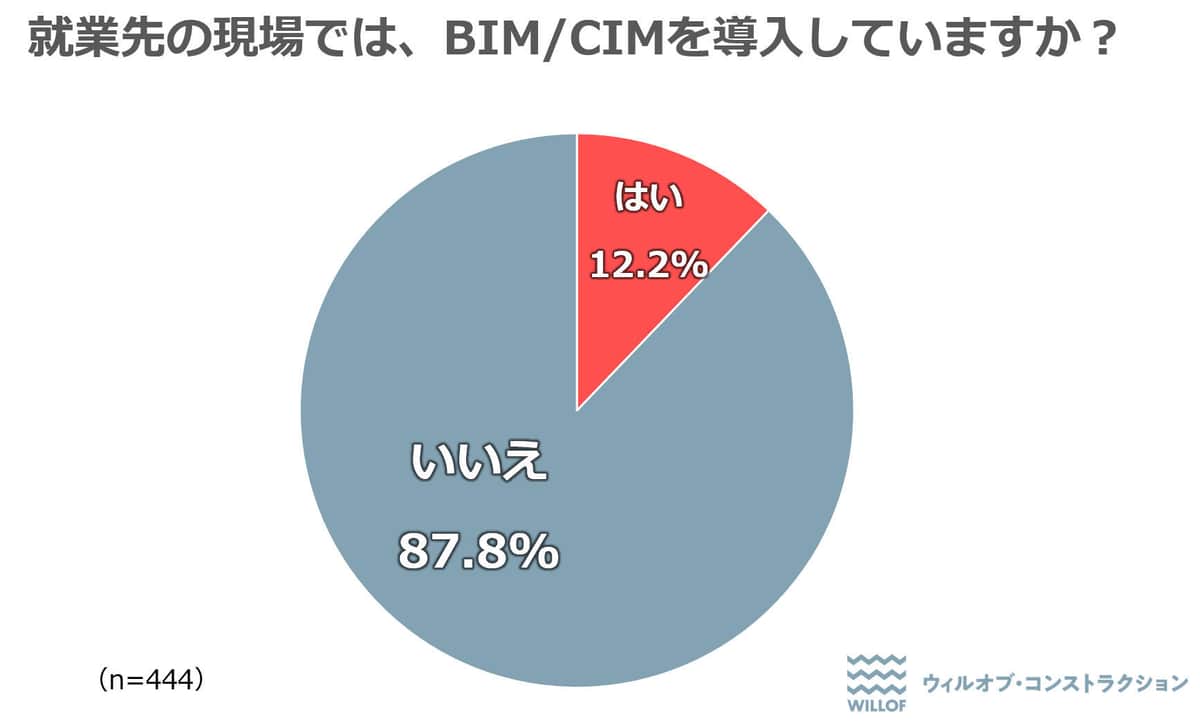 今回の調査によると、「はい」と答えた人は12.2%、「いいえ」が87.8%。建設現場におけるBIM/CIMの導入率はまだ低かった。導入ハードルの改善が必要な状況のようだ。