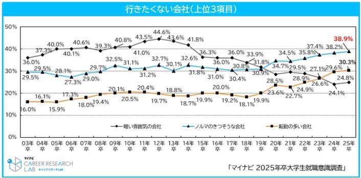 調査ではつづいて、「行きたくない会社」を聞いた。その結果、「ノルマのきつそうな会社」が前年に続き、最多で38.9%(前年比0.7ポイント増)。2番目に回答が多かったのは「転勤の多い会社」で30.3%(前年比0.7ポイント増)となった。