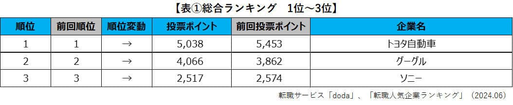 パーソルキャリアが運営する転職サービス「doda」は22~59歳のビジネスパーソン5062人を対象にした「転職したい会社」を調査し、「doda転職人気企業ランキング2024」としてまとめた。