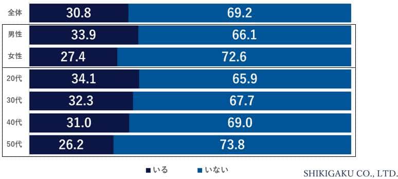 調査でははじめに、あなたの職場に「マウンティング上司」がいるか質問した。すると、30.8%が「いる」と回答した。性年代別で大きな差は見られないが、「マウンティング上司」が「いる」と回答したのは、男性がやや多い傾向だ。