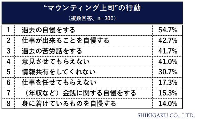 つぎに、「あなたの職場にいる『マウンティング上司』について、あてはまる行動をすべてお答えください」と聞いた。