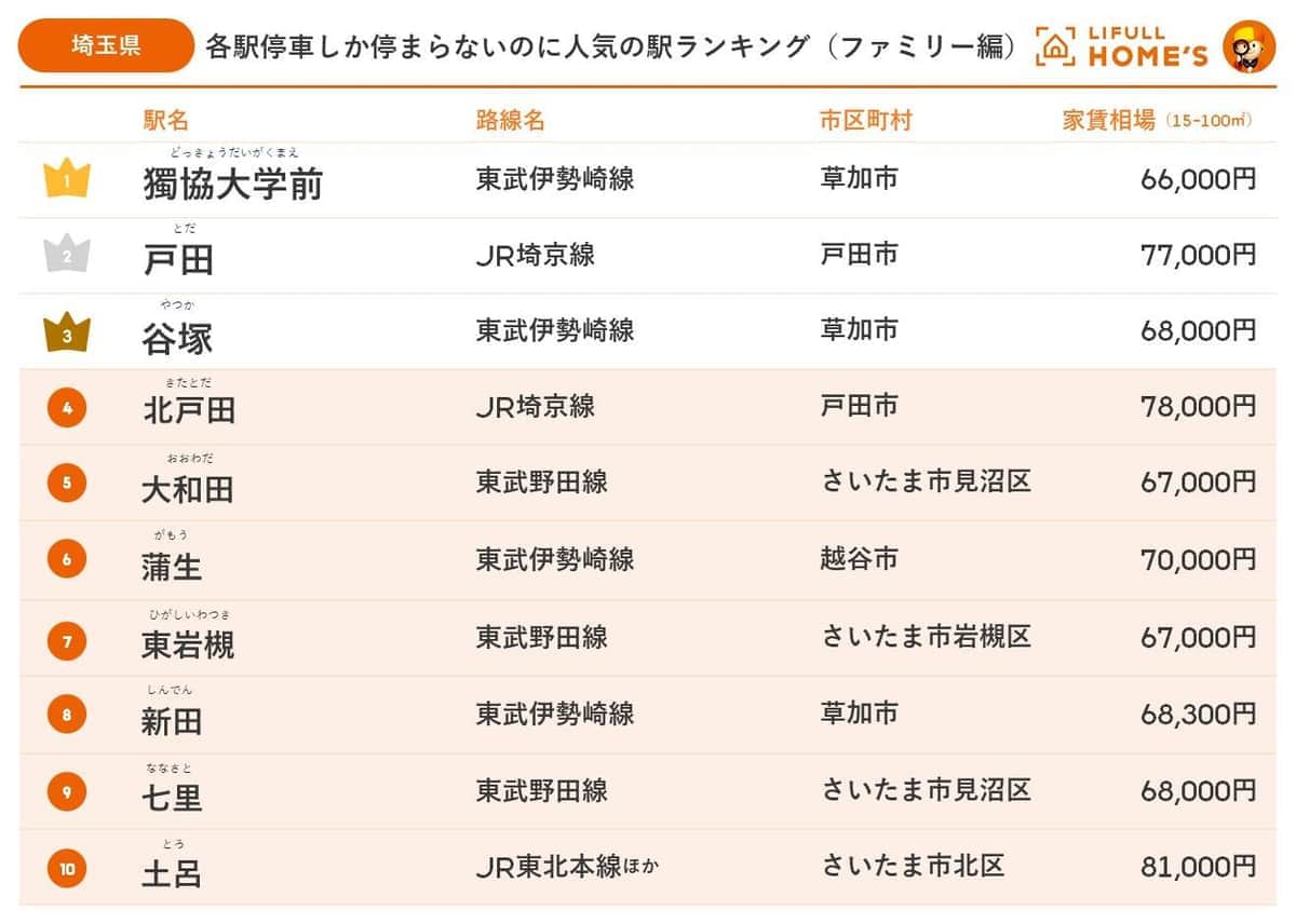 各駅停車しか停まらないのに人気の駅ランキング【埼玉県・ファミリー編】 3位「谷塚」、2位「戸田」、1位は?