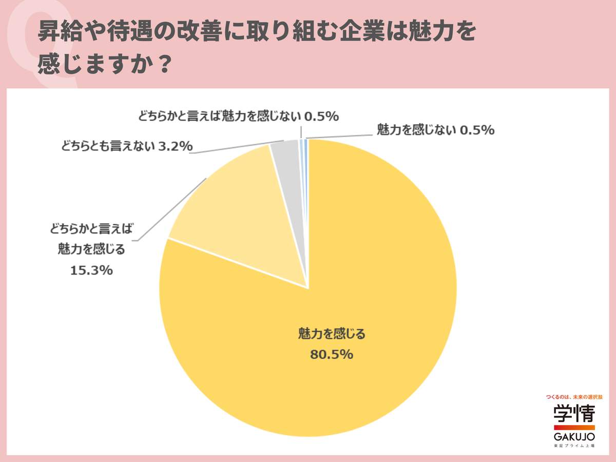 調査では、昇給や待遇の完全に取り組む企業は魅力を感じるか聞いた。「魅力を感じる」と回答した人は80.5%に達した。「どちらかと言えば魅力を感じる」の15.3%を合わせると、95.8%の人が、昇給や待遇改善に取り組む企業に魅力を感じている。