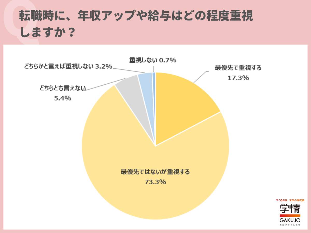 続いて、転職時に、年収アップや給与はどの程度重視するか聞いた。その結果、「最優先で重視する」は17.3%だった。なお、最も回答を集めたのは、「最優先ではないが重視する」で73.3%となった。