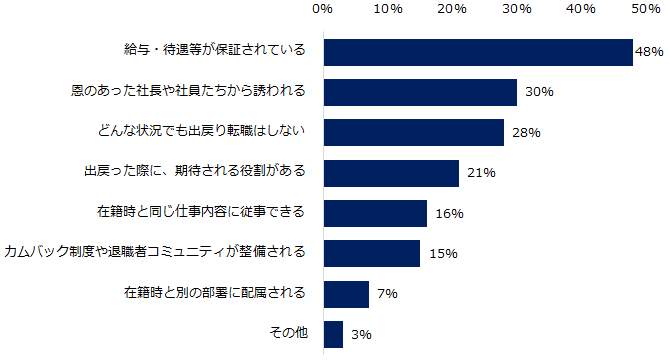さらに、「出戻り転職したことがない」と回答した人に「どんな条件・状況があれば、出戻り転職を検討しますか?」と質問した。「給与・待遇等が保証されている」が48%に達した。次いで「恩のあった社長や社員たちから誘われる」が30%、「どんな状況でも出戻り転職はしない」が28%、「出戻った際に、期待される役割がある」が21%となった。