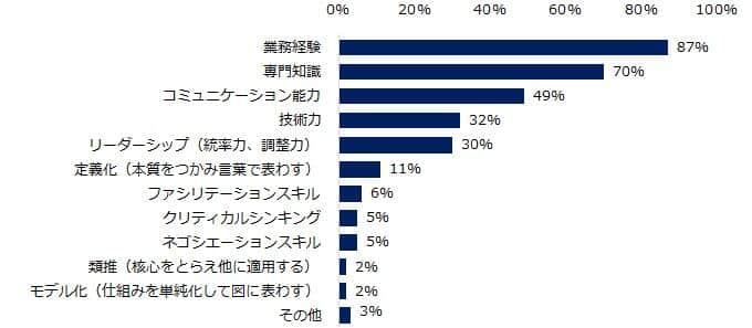 すると、「業務経験」(87%)、「専門知識」(70%)、「コミュニケーション能力」(49%)が上位だった。さらに「選択した3つの中で最も重視しているポイントは何ですか?」と聞くと、56%が「業務経験」と回答した。いずれの問いでも、「業務経験」がトップを占めた。