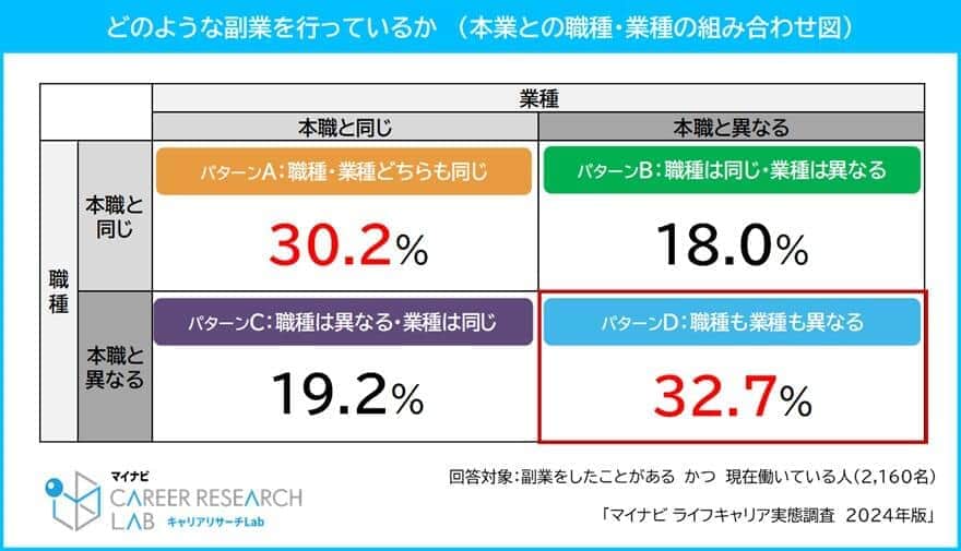 調査では、副業を行ったことがある人の本職と副業の職種・業種の組み合わせについて質問した。副業と本業で「職種・業種ともに異なる」人は32.7%、「職種・業種ともに同じ」は30.2%だった。