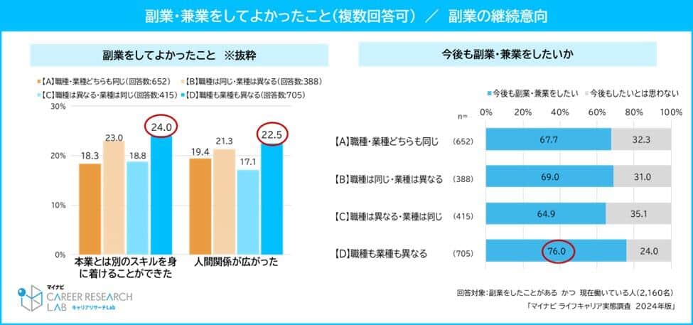 続いて、副業・兼業をしてよかったことを聞くと、「職種・業種ともに異なる」人は、「本業とは別のスキルを身に着けることができた」(24.0%)、「人間関係が広がった」(22.5%)がほかの組み合わせと比べても高くなった。