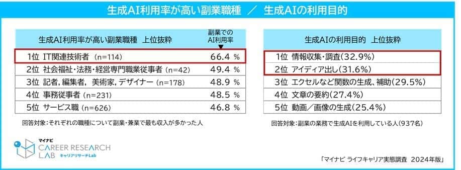さらに、生成AIの利用目的で多かったのは、「情報収集・調査」が32.9%、「アイディア出し」が31.6%、「エクセルなど関数の生成、補助」が29.5%となった。利用者は副業業務を効率よく進めるための補助的ツールとして生成AIを使っていることがわかる。