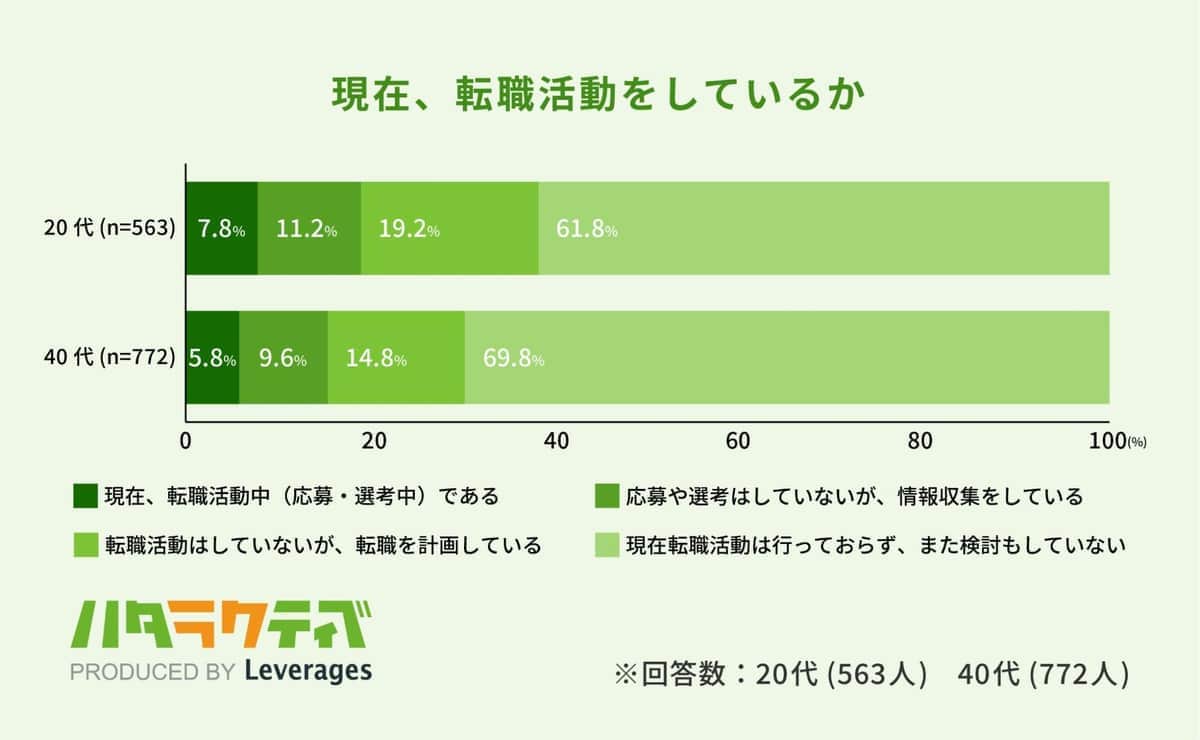 この調査は、若者のキャリア意識を把握するため、20代と40代の正社員1,335名(20代:563名・40代:772名)を対象に、現在の転職活動に関する調査を行った。