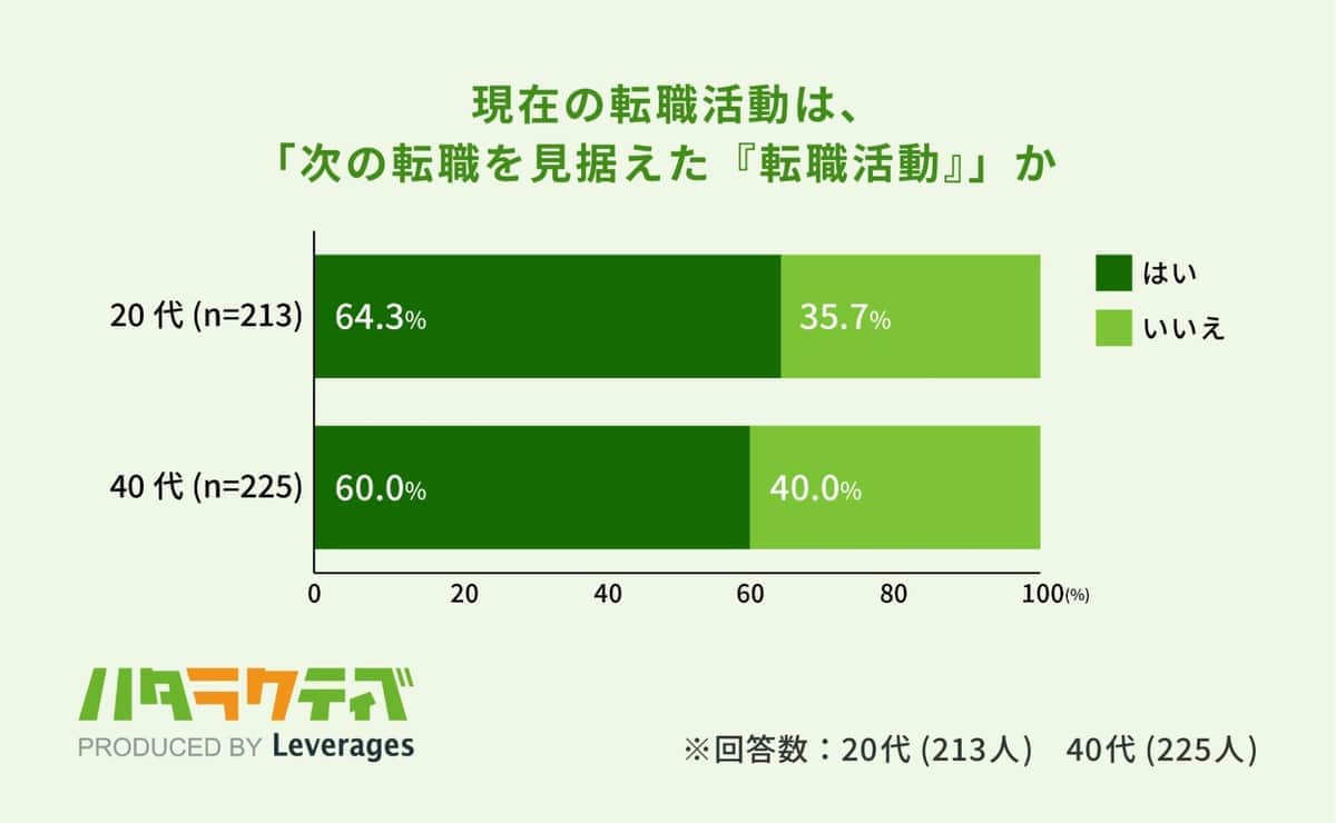 続いて、「転職顕在層」と「転職潜在層」に対して、現在の転職活動について聞くと、6割以上(20代:64.3%、40代:60.0%)が「次の転職を見据えた『転職活動』である」と回答した。