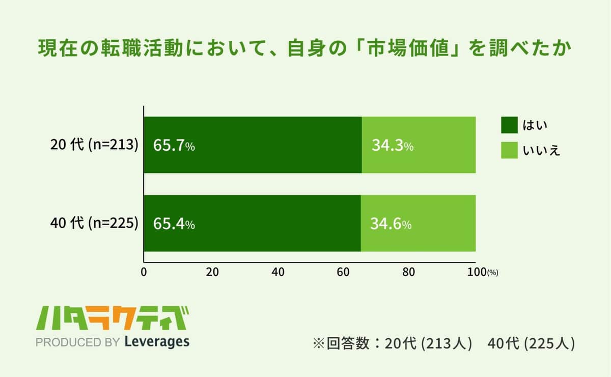 転職活動前に自分の市場価値調べた人 20代で65.7%、40代でも65.4%