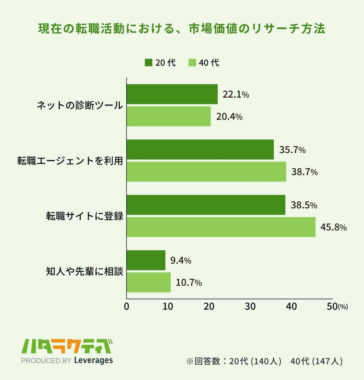 次に、「現在の転職活動において自身の『市場価値』を調べたか」という問いでは、20代40代ともに約7割(20代:65.7%、40代:65.4%)が「調べた」と回答した。「市場価値」を調べた方法は、「転職サイトに登録」が最も多く約4割(20代:38.5%、40代:45.8%)、次いで「転職エージェントを利用」(20代:35.7%、40代:38.7%)と続いた。