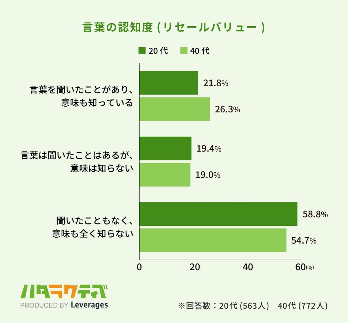 さらに、キャリアにおける「リセールバリュー」、次に転職活動する際の自身の再販価値について調査すると、認知度と理解度に関しては、20代の21.8%で約5人に1人が、40代の26.3%の約4人に1人が「言葉を聞いたことがあり、意味も知っている」と答えた。