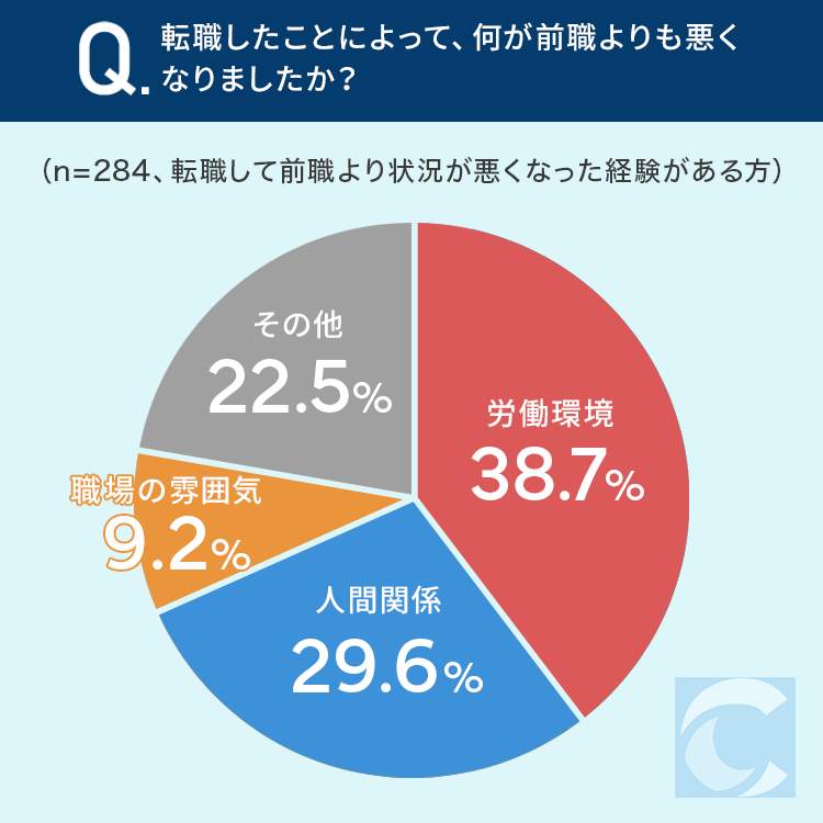 つぎに、「転職したことによって、何が前職よりも悪くなりましたか?」と聞いたところ、「労働環境」が38.7%、「人間関係」が29.6%、「職場の雰囲気」が9.2%となった。