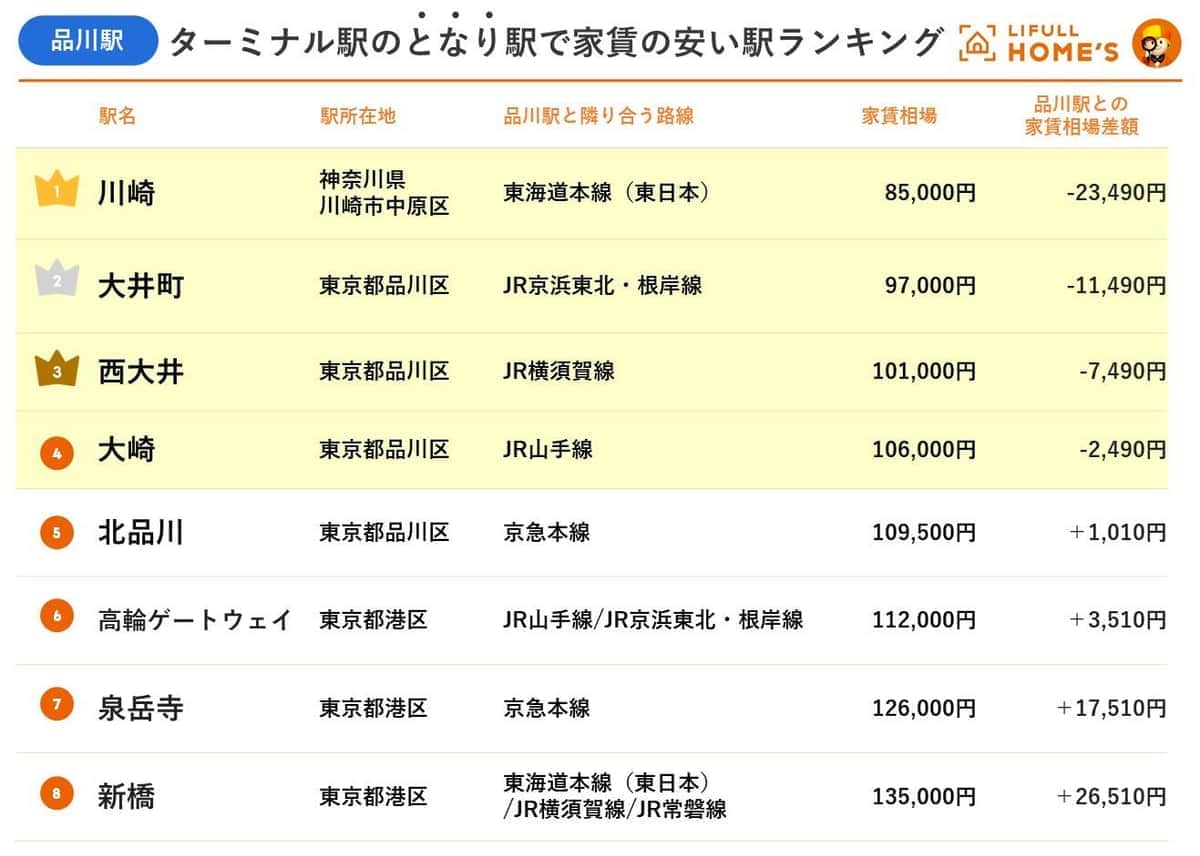 調査の結果、1位は東海道本線のとなり駅「川崎」(同8万5000円)。品川との家賃相場差額は2万3490円。