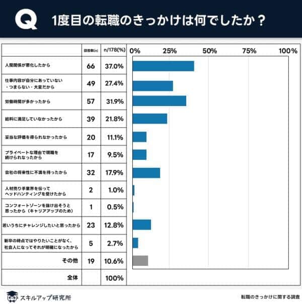 続いて、転職のきっかけについて聞くと、「人間関係が悪化したから」が37.0%、「労働時間が多かったから」が31.9%、「仕事内容が自分に合っていない。つまらない。大変だから」が27.4%、「給料に満足していなかったから」が21.8%と続いた。