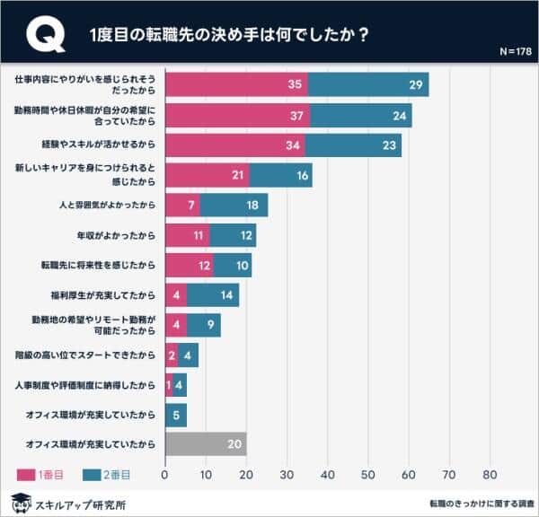 また、転職先を決定した決め手は何だったのか質問すると、1番目の理由で多かったのが、「勤務時間や休日休暇が自分の希望に合っていたから」、「仕事内容にやりがいを感じられそうだったから」、「経験やスキルが活かせるから」が並んだ。