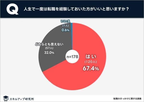 最後に、「人生で一度は転職を経験しておいた方がいいと思いますか?」と聞くと、「はい」は67.4%、「いいえ」は0.6%、「どちらとも言えない」が32.0%だった。