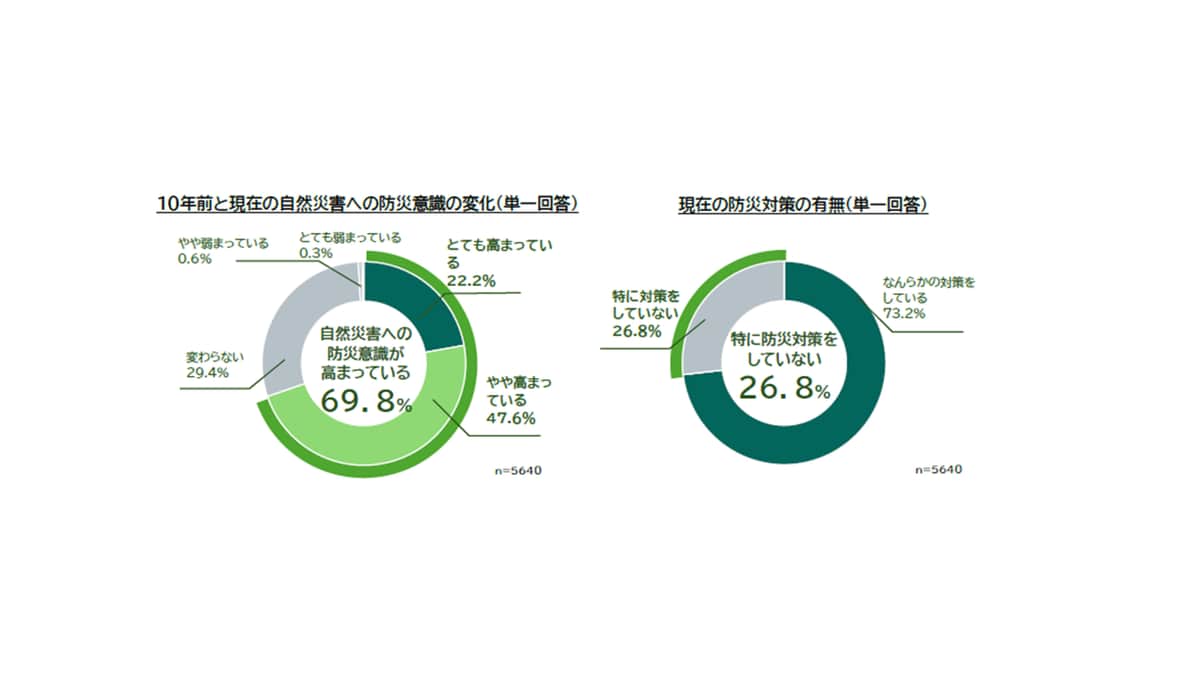 調査では「10年前と現在の自然災害への防災意識の変化」について聞いたところ、69.8%が「高まっている」と回答した(「とても高まっている」22.2%、「やや高まっている」47.6%の合計)。また、「現在の防災対策の有無」を聞くと、「なんらかの対策をしている」は73.2%。「特に対策をしていない」は26.8%だった。