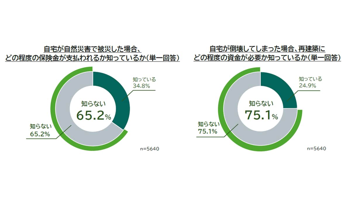 さらに調査では、自宅が自然災害で被災した場合、どの程度の保険金が支払われるか「知らない」は65.2%、自宅が倒壊してしまった場合、再建築にどの程度の資金が支払われるか「知らない」は75.1%という結果も出ている。契約内容の把握から始めることが必要なようだ。