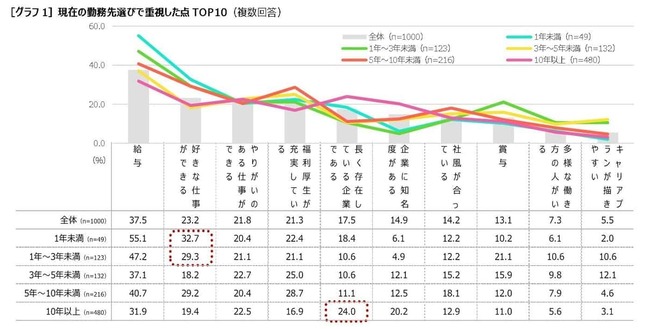まず、現在の勤務先を選ぶ際に何を重視したかを聞くと、最多は「給与」で37.5%。次いで、「好きな仕事ができる」23.2%、「やりがいのある仕事ができる」21.8%、「福利厚生が充実している」21.3%の順となった。
