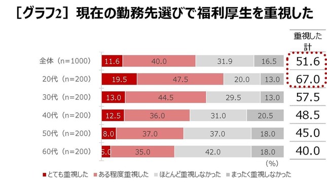 現在の勤務先選びで福利厚生を重視したかという質問では、51.6%(とても重視した11.6%、ある程度重視した40.0%の合計)と、半数を超える人が「重視した」と回答。世代別でみると、「重視した」という20代は19.5%、30代は13.0%、40代は12.5%となるなど、若い世代ほど高い傾向だった。