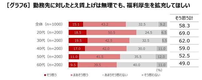 一方で、勤務先に対したとえ賃上げは無理でも、福利厚生を拡充してほしいかと聞くと、58.3%が「そう思う」(そう思う15.1%、まあそう思う43.2%の合計)という結果に。世代別に見ると、20代が69.0%、30代が62.0%と、若い世代の望む声が高い傾向が見られた。