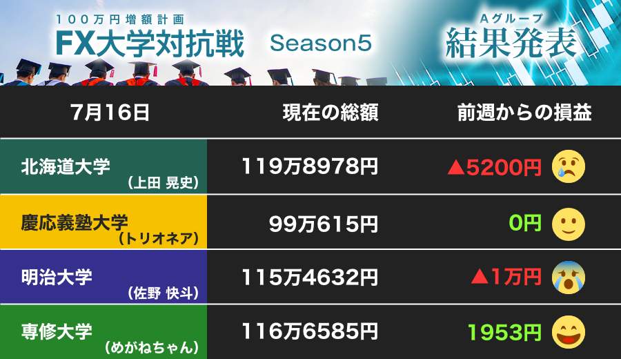 「マジメ」な専修大が着実にプラス積み上げ、北大を追う 慶大は久々をポンドで挑戦(第8節)【FX大学対抗戦 Aグループ】