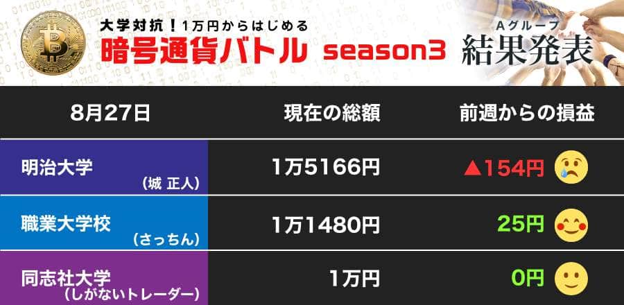 コツコツ利益積み上げる明大、ビットコインの上昇に乗った職業大(第13節)【暗号通貨バトル Aグループ】
