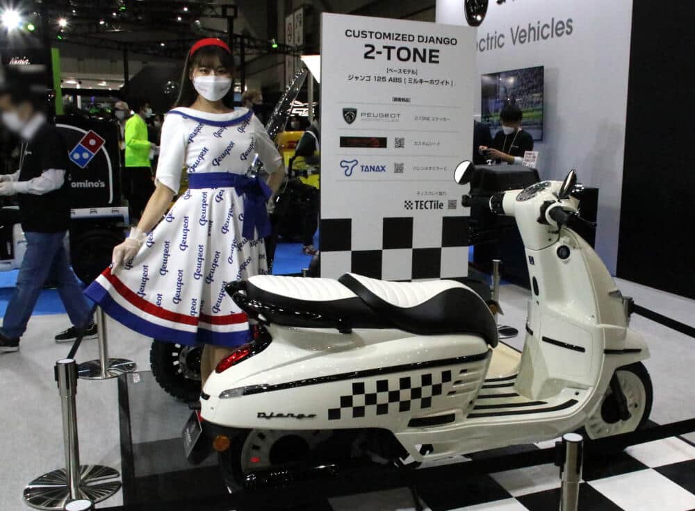 「アイディア・プジョーモトシクルブースに展示されたプジョー カスタマイズド ジャンゴ 2-TONE」(撮影:会社ウォッチ編集部)