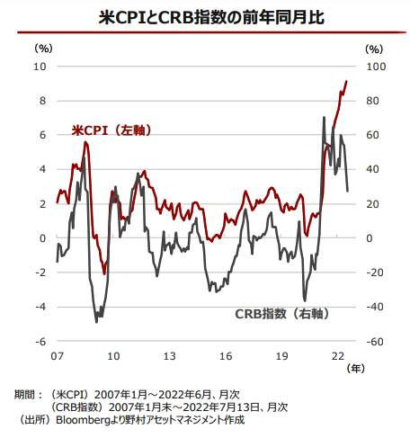 (図表2)米消費者物価指数(CPI)と国際商品先物指数(CRB)の推移(野村アセットマネジメントの作成)