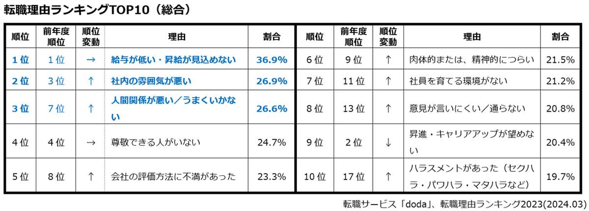 転職理由ランキングTOP10(総合)(転職サービスdoda「転職理由ランキング」から)