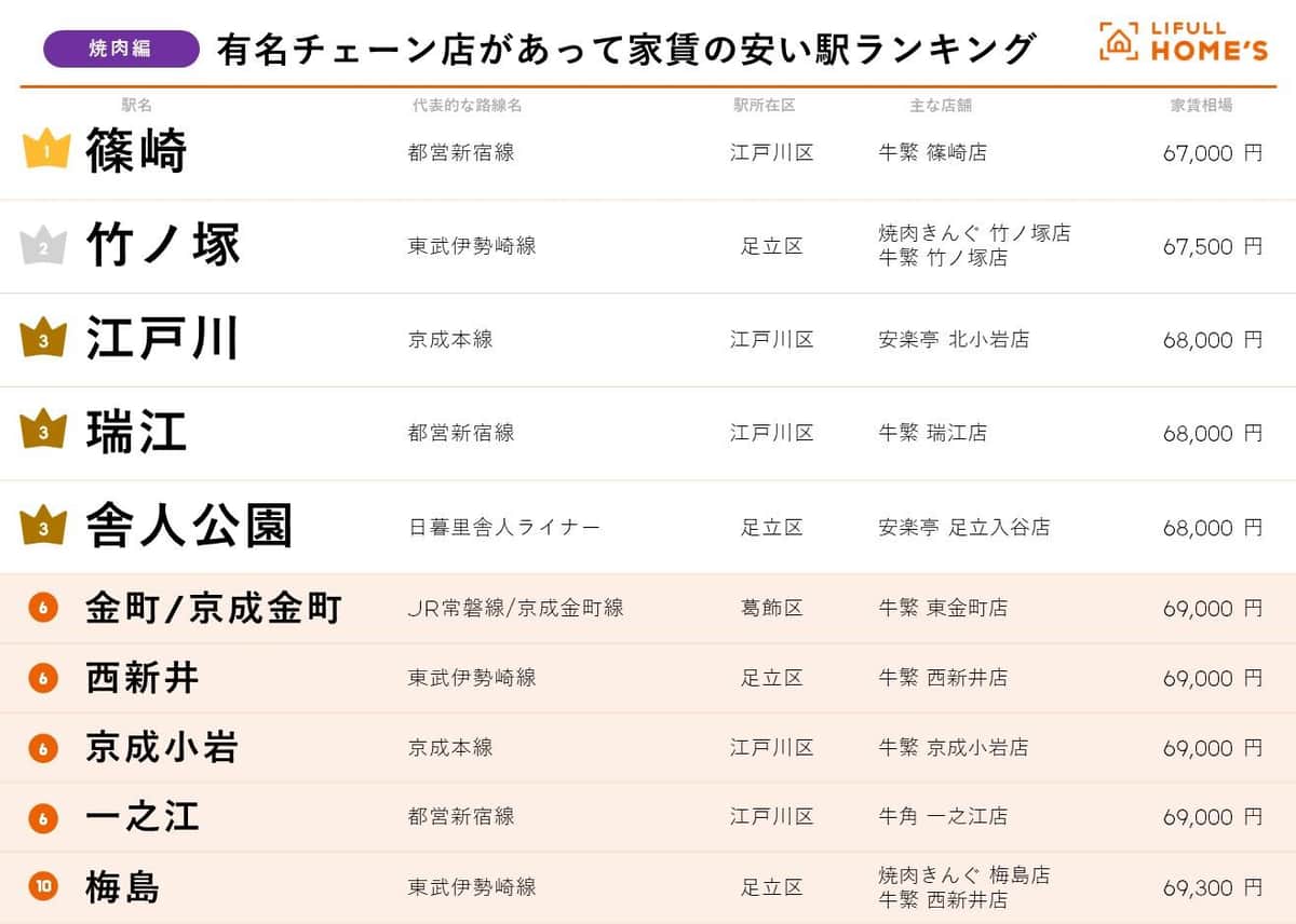 【焼肉編】東京23区「外食チェーン店」がある家賃の安い5駅は?